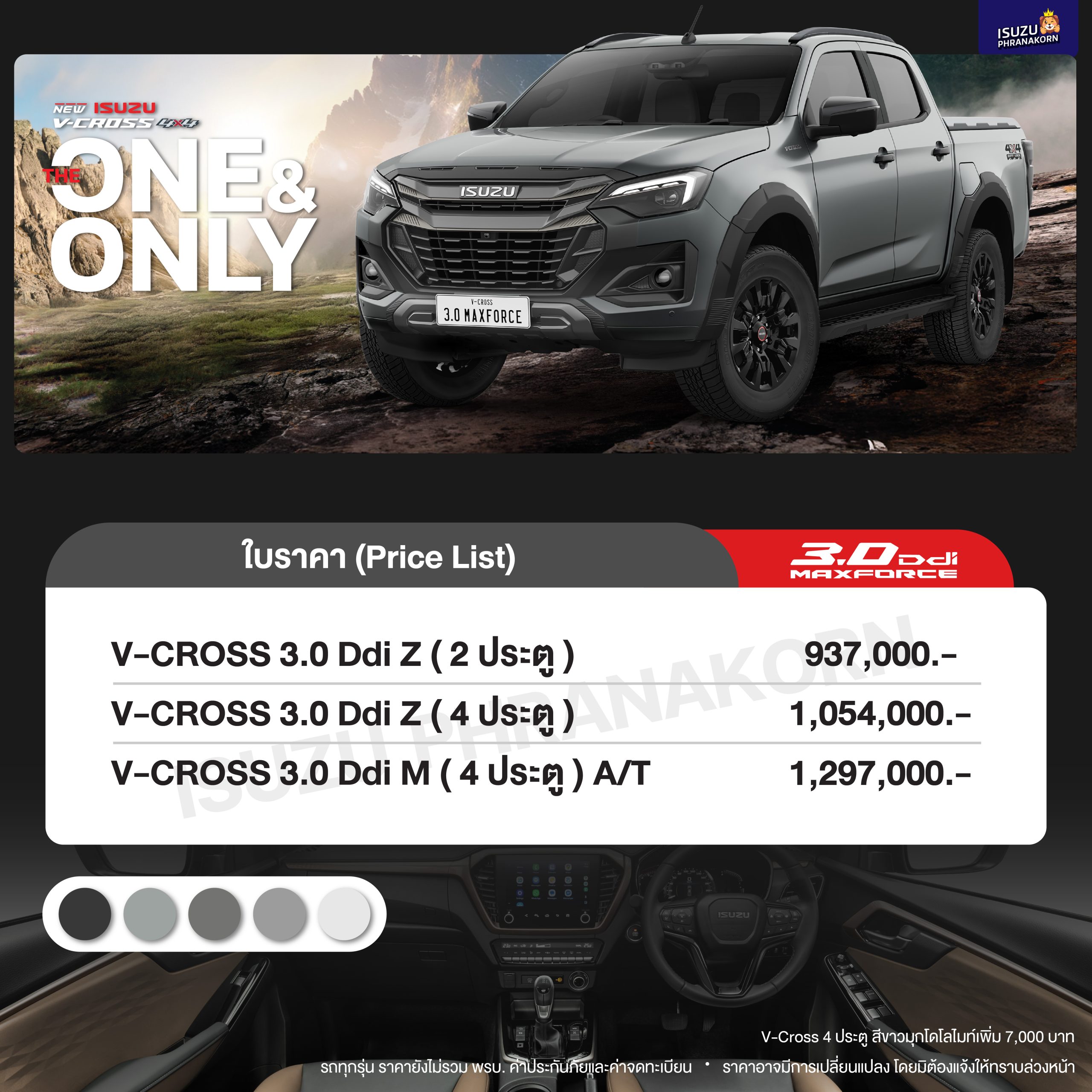 - สำหรับรถยนต์รุ่น Spark, Spacelab, Hi-Lander 2 Door และ Cab 4 สีเมทาลิค ชำระเงินเพิ่ม 7,000 บาท / Hi-Lander 4 Door และ V-Cross 4 Door สีขาวมุก ชำระเงินเพิ่ม 7,000 บาท / Isuzu Mu-X สีขาวมุก ชำระเงินเพิ่ม 12,000 บาท