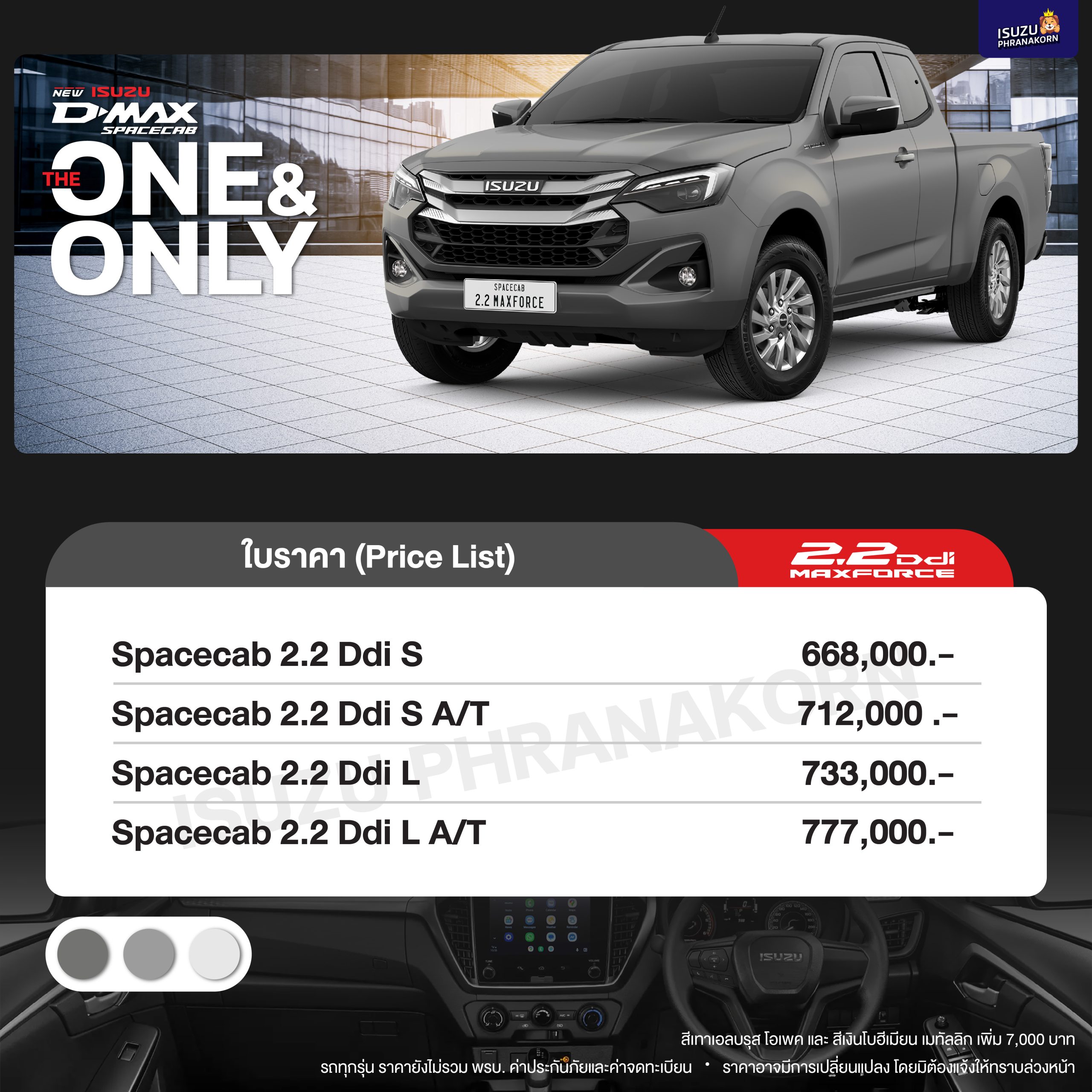 - สำหรับรถยนต์รุ่น Spark, Spacelab, Hi-Lander 2 Door และ Cab 4 สีเมทาลิค ชำระเงินเพิ่ม 7,000 บาท / Hi-Lander 4 Door และ V-Cross 4 Door สีขาวมุก ชำระเงินเพิ่ม 7,000 บาท / Isuzu MU-X Blue Power และ Isuzu Mu-X รุ่นพิเศษ The ONYX สีขาวมุก ชำระเงินเพิ่ม 12,000 บาท