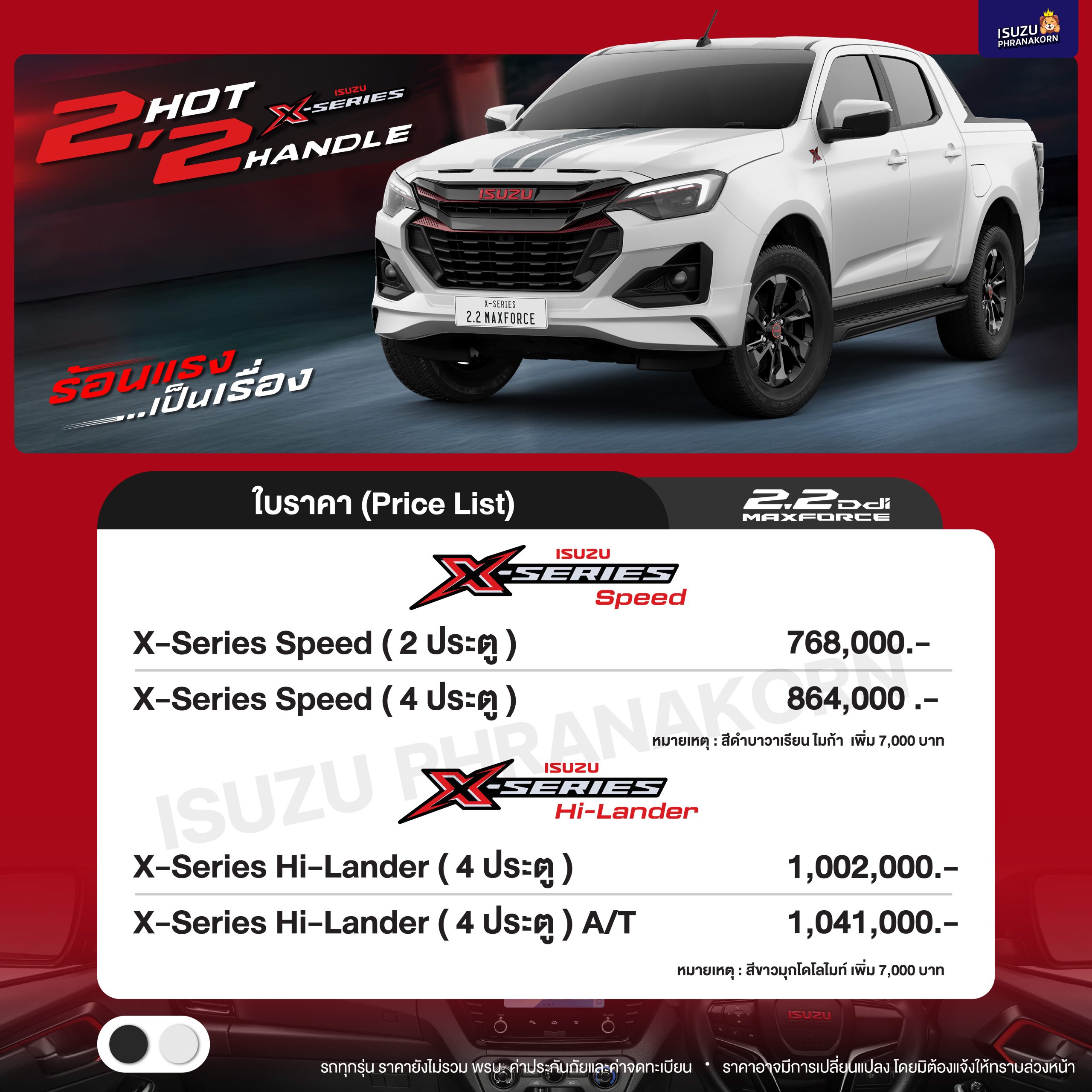 - สำหรับรถยนต์รุ่น Spark, Spacelab, Hi-Lander 2 Door และ Cab 4 สีเมทาลิค ชำระเงินเพิ่ม 7,000 บาท / Hi-Lander 4 Door และ V-Cross 4 Door สีขาวมุก ชำระเงินเพิ่ม 7,000 บาท / Isuzu MU-X Blue Power และ Isuzu Mu-X รุ่นพิเศษ The ONYX สีขาวมุก ชำระเงินเพิ่ม 12,000 บาท