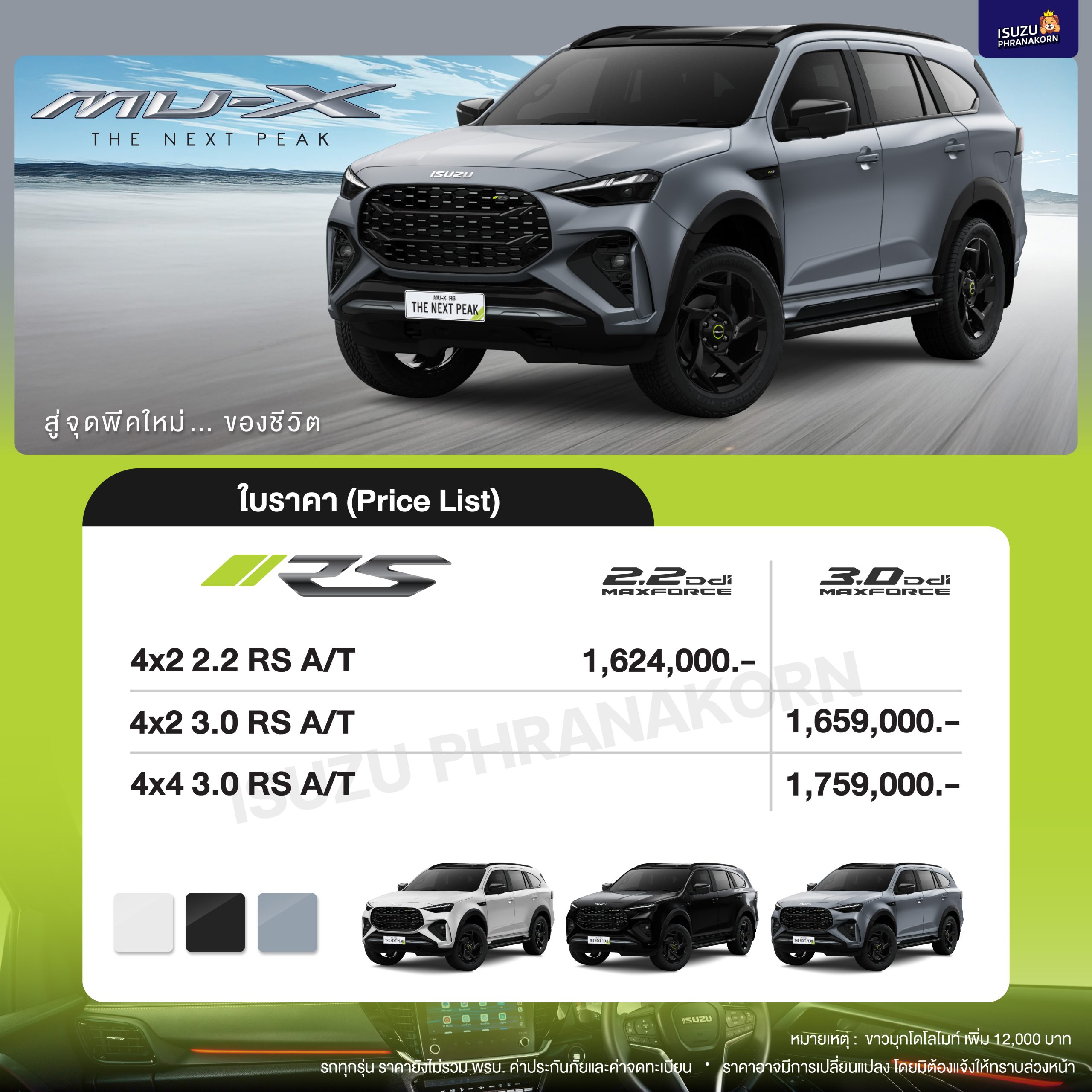 - สำหรับรถยนต์รุ่น Spark, Spacelab, Hi-Lander 2 Door และ Cab 4 สีเมทาลิค ชำระเงินเพิ่ม 7,000 บาท / Hi-Lander 4 Door และ V-Cross 4 Door สีขาวมุก ชำระเงินเพิ่ม 7,000 บาท / ALL-NEW MU-X สีขาวมุก ชำระเงินเพิ่ม 12,000 บาท